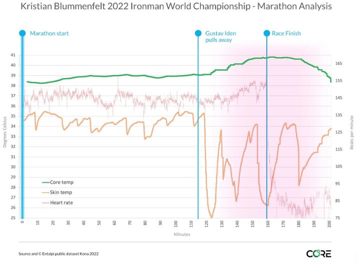 Gegevens over de kerntemperatuur van het lichaam en de huidtemperatuur werden verzameld met een CORE-sensor die Blummenfelt tijdens de hele triatlon droeg.