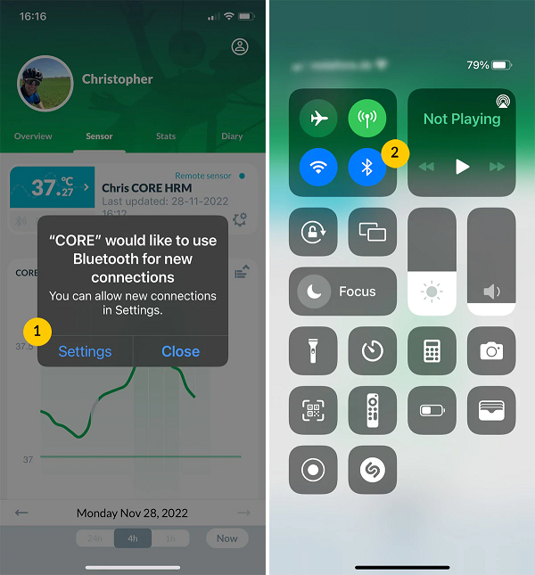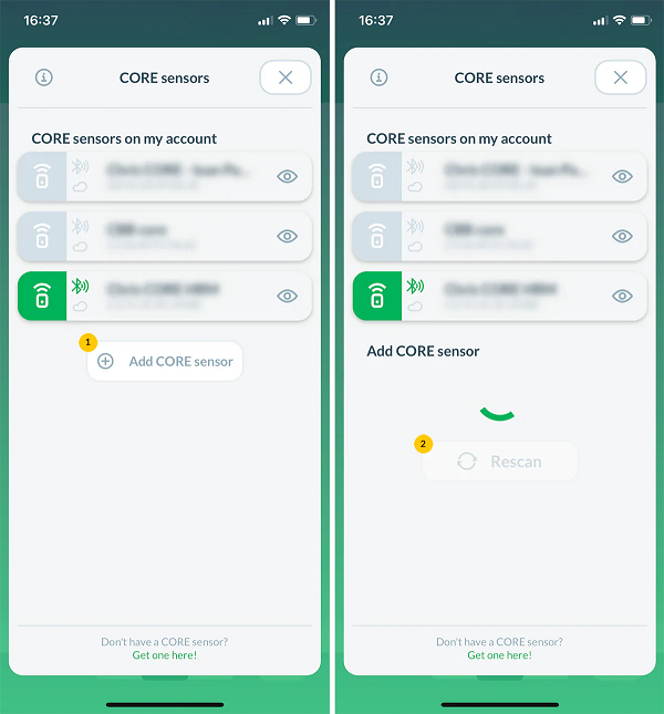Voeg sensoren toe door te klikken op (1) "Add CORE sensor". Als je CORE sensor niet wordt gevonden, zorg dan dat hij in de buurt is van je telefoon en schud hem om te controleren of hij aanstaat, klik dan op (2) "Rescan".